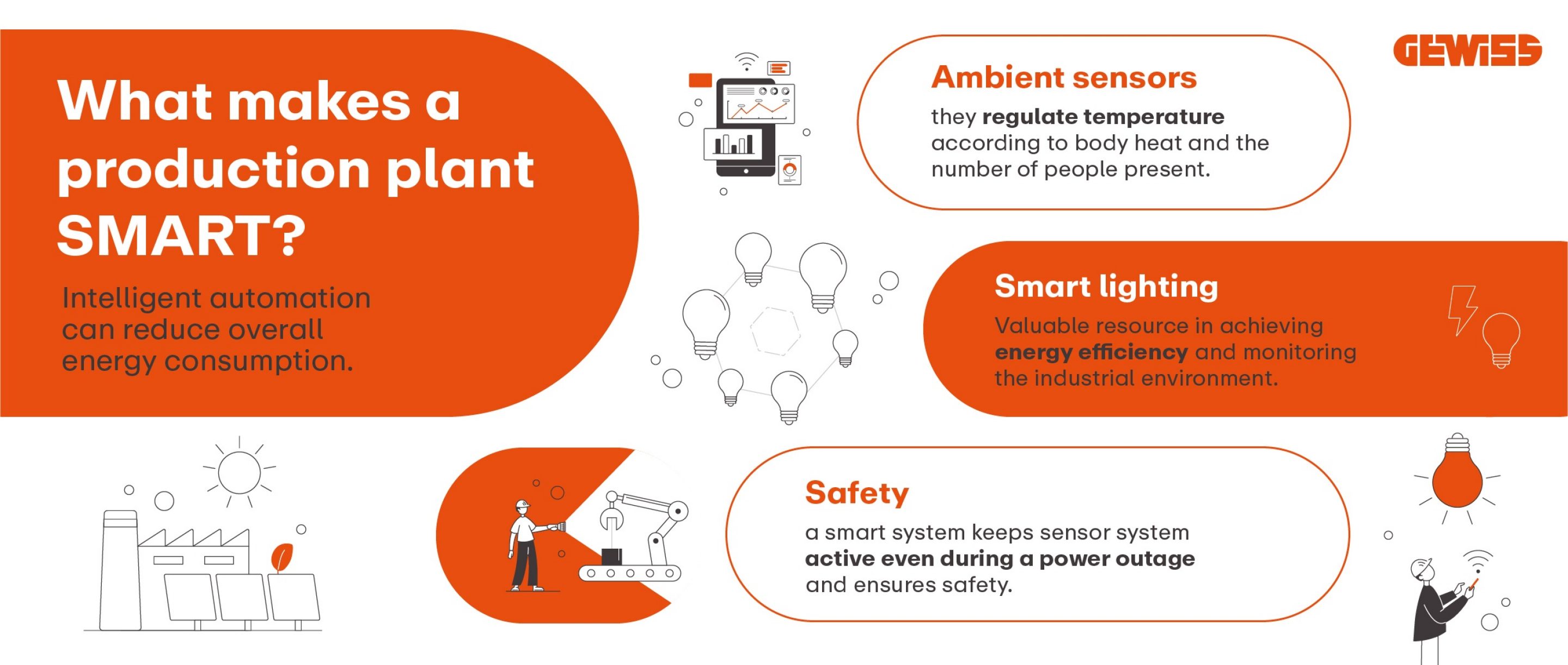 A production plant becomes smart when its ecosystem includes ambient sensors, smart lighting systems, energy distribution infrastructure and network-connected energy management, which intercommunicate to ensure safety and energy efficiency.