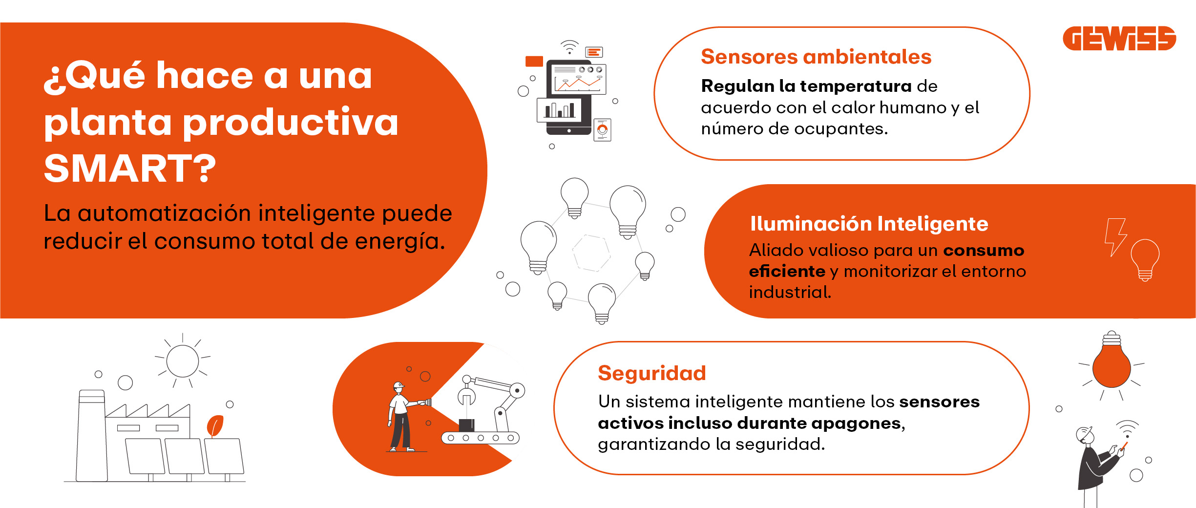 Una planta de producción inteligente es tal porque en su ecosistema existen sensores ambientales, sistemas de iluminación inteligentes, infraestructuras de distribución y gestión de energía en red, que se comunican entre sí para garantizar la seguridad y la eficiencia energética.