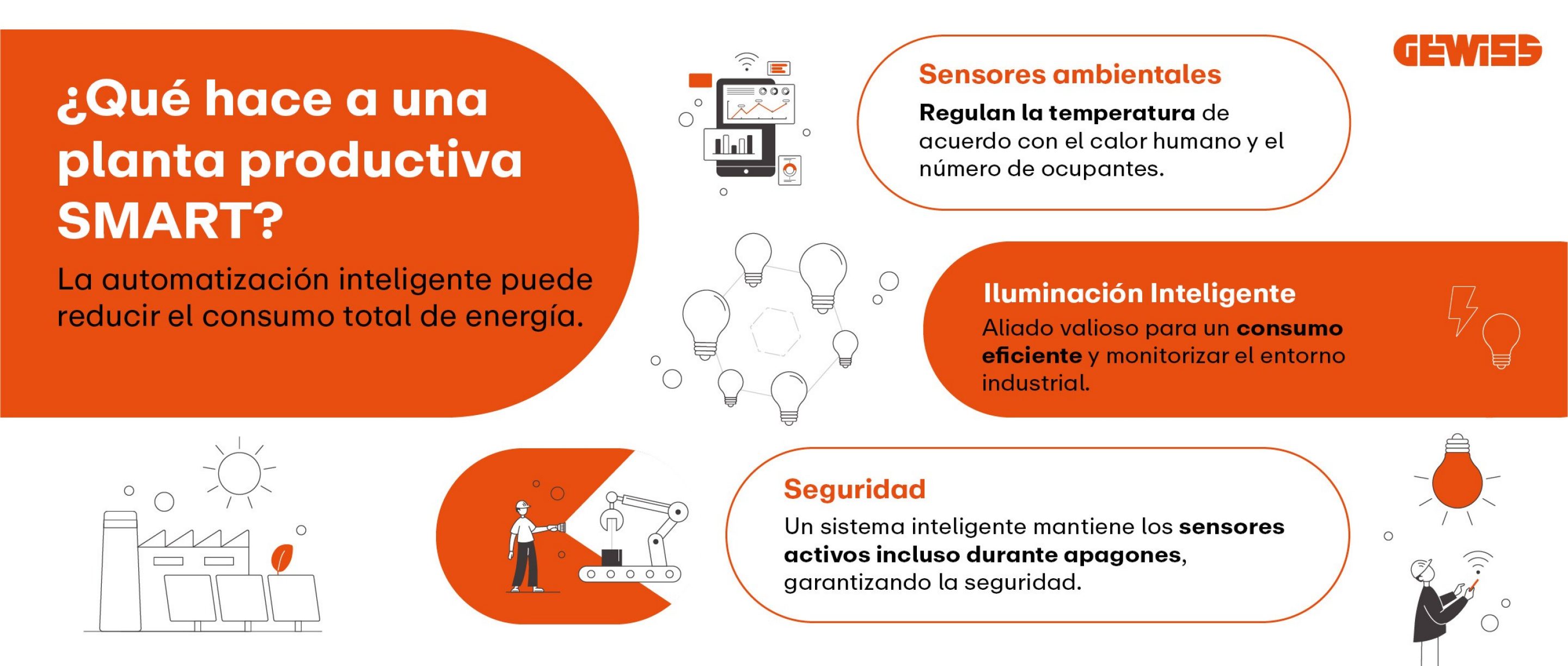 Una planta de producción inteligente es tal porque en su ecosistema existen sensores ambientales, sistemas de iluminación inteligentes, infraestructuras de distribución y gestión de energía en red, que se comunican entre sí para garantizar la seguridad y la eficiencia energética.