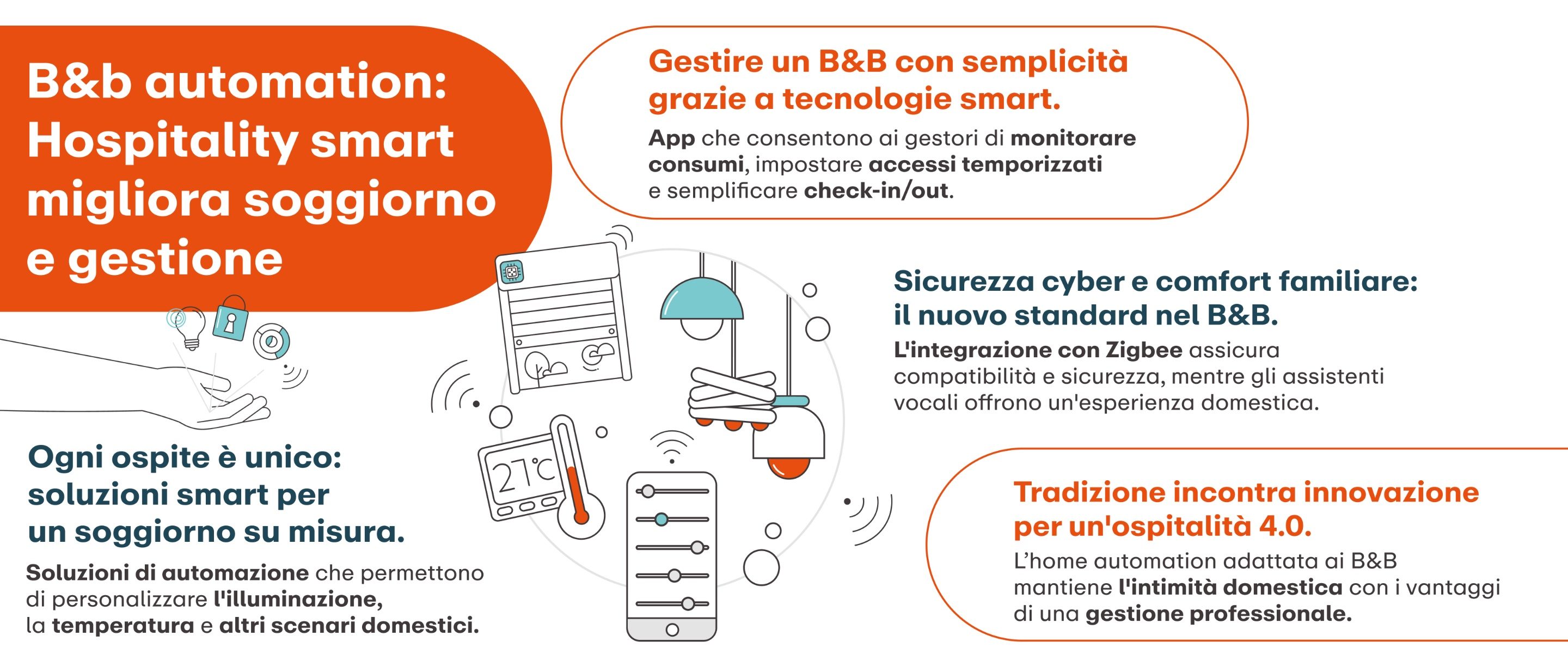 Un beneficio per l’utente finale, ma anche per i gestori dell’hospitality. Infatti, oltre a migliorare il soggiorno, le app di gestione del b&b permettono di impostare accessi temporizzati, monitorare i consumi e fornire interazioni vocali che semplificano anche le fasi di check-in e check-out.