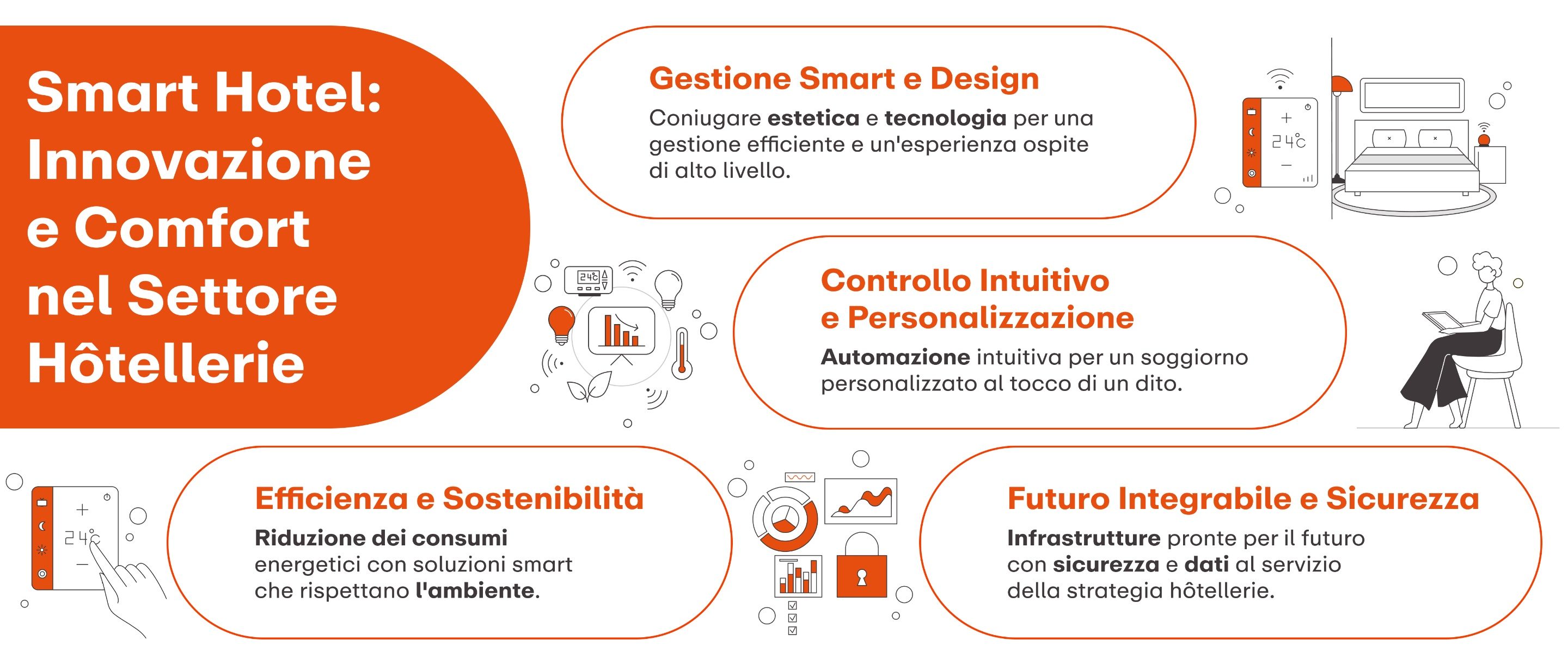 L'home automation, perfetta per i contesti privati, si rivela molto preziosa anche nel contesto hôtellerie: offre una gestione più semplice da remoto, il monitoraggio dei consumi delle strutture ricettive, sistemi di sicurezza e accreditamento smart e un'esperienza più coinvolgente e rilassante per gli ospiti in tutti gli ambienti, adattandosi a strutture di ogni dimensione.