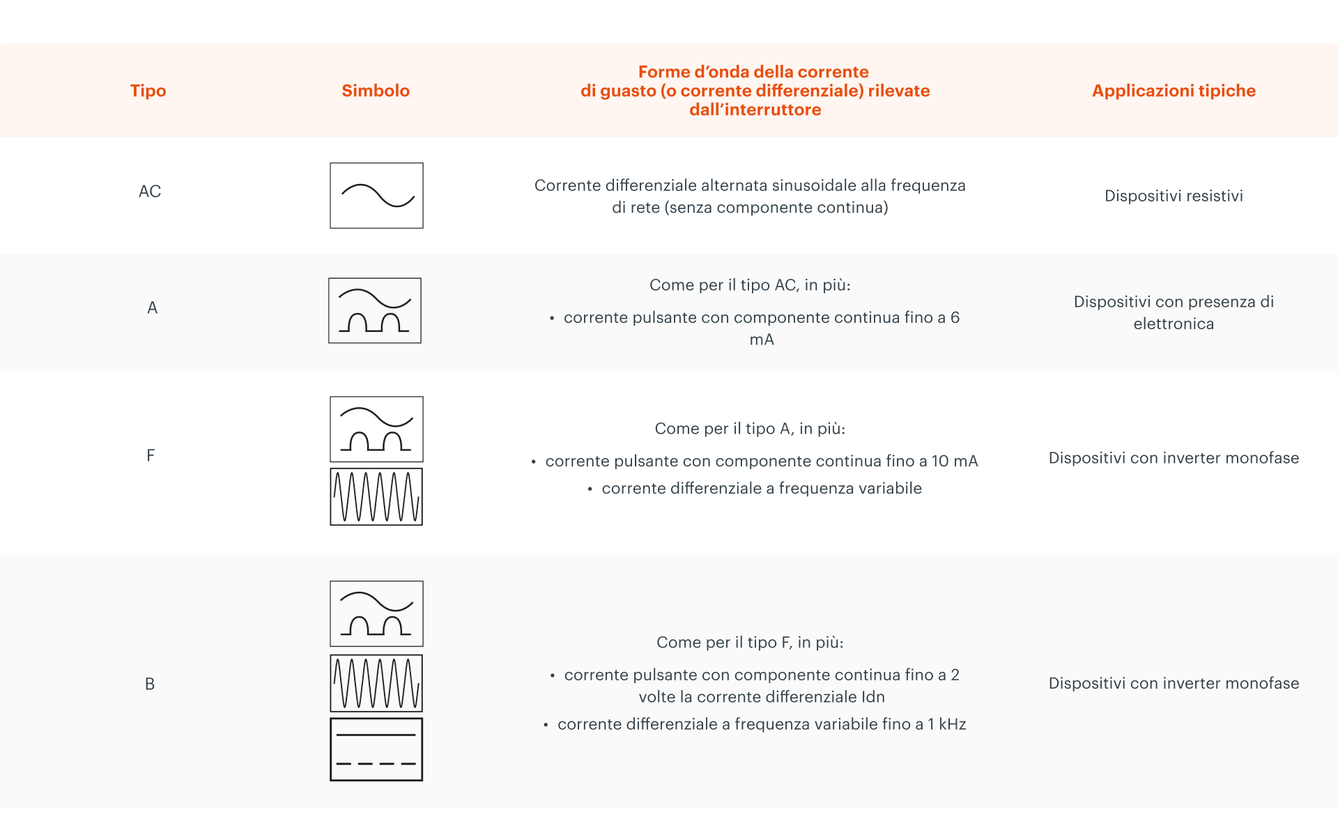 Ecco una tabella con ogni classe di interruttore differenziale che ne riassume le caratteristiche principali:
