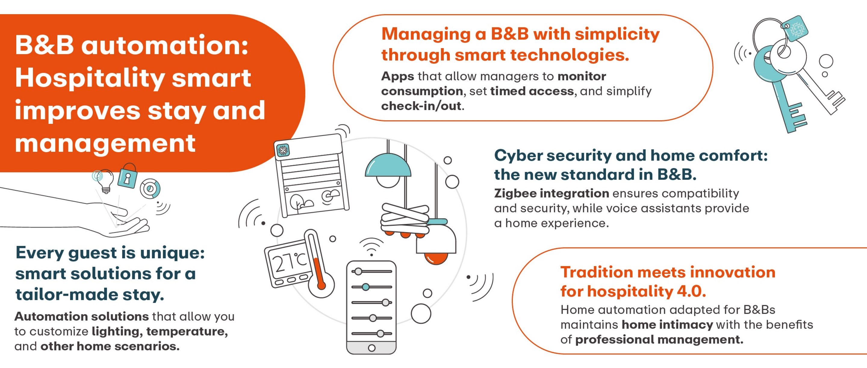 A benefit for the end user as well as for the hospitality managers. In addition to improving the stay, the B&B management apps can be configured for time-controlled access, to monitor consumption and to provide vocal interaction that simplifies the check-in and check-out procedure.