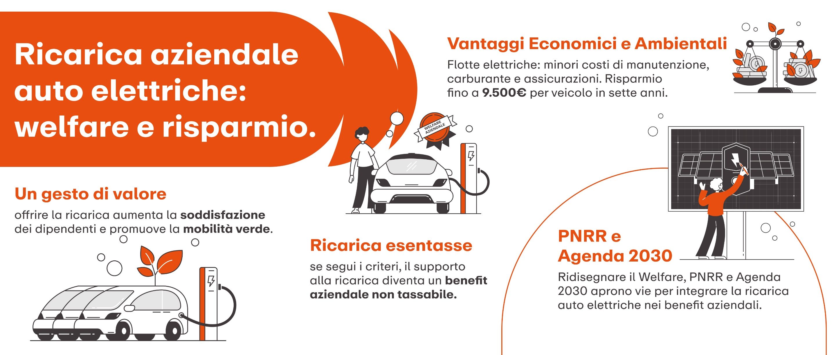 E proprio in virtù di questi obiettivi condivisi da entrambi gli schemi di azione, essi costituiscono ottimi framework su cui ripensare il Welfare Aziendale perché includa le auto elettriche e le infrastrutture di ricarica. L’interpretazione di Agenzia delle Entrate che abbiamo visto è un’apertura significativa al tema, ma si sente forte il bisogno di chiarire e incentivare con decisione le politiche di benefit legate alla mobilità sostenibile e ai suoi tanti benefici.
